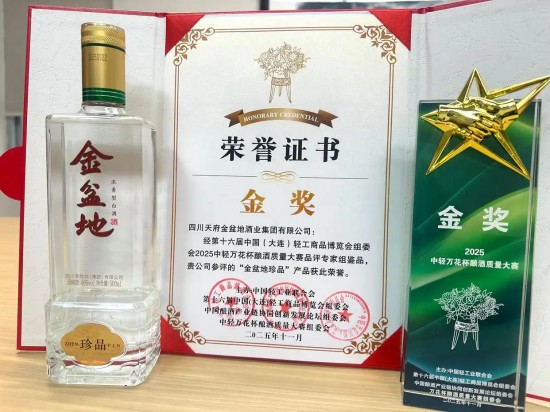 在本届博览会首次举办的2025中轻质量万花杯酿酒质量大赛中,四川天府金盆地酒业集团有限公司旗下产品“一品江山1921”、“金盆地珍品”、“古蜀州”凭借卓越品质与厚重文化,分别斩获“大金奖”“金奖”“创新力产品奖”三项大奖。